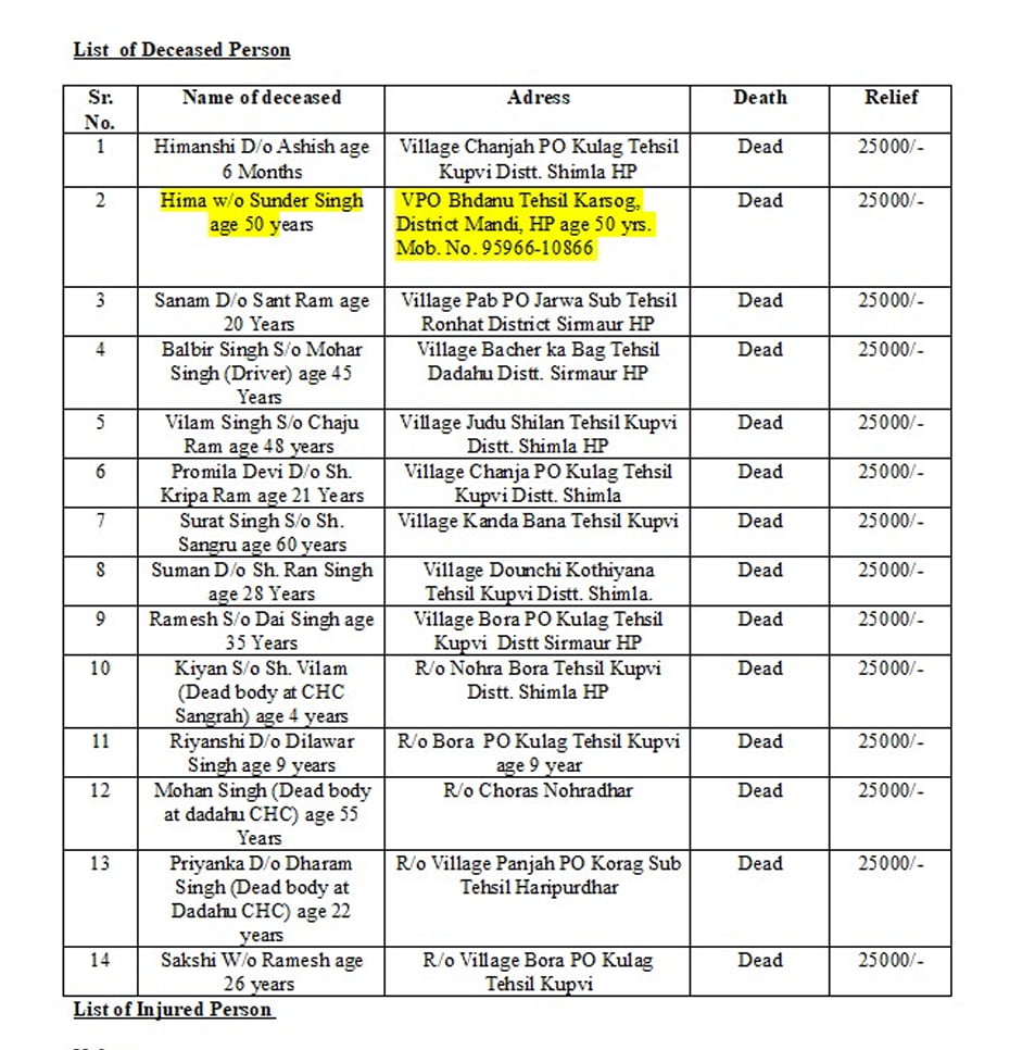 उपायुक्त सिरमौर प्रियंका वर्मा ने पुष्टि की कि इस हादसे में 14 लोगों की मौत हुई है और 61 लोग घायल हैं। एसपी एनएस नेगी ने भी माना कि बस क्षमता से अधिक भरी हुई थी, जबकि हादसे के प्राथमिक कारणों में सड़क पर जमी पाले के कारण स्किड होना बताया जा रहा है।