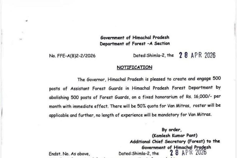 सरकार ने फॉरेस्ट गार्ड के 500 नियमित पदों को समाप्त कर उनकी जगह 500 असिस्टेंट फॉरेस्ट गार्ड के नए पद सृजित करने की अधिसूचना जारी कर दी है। यह निर्णय तत्काल प्रभाव से लागू कर दिया गया है- जिससे विभागीय ढांचे और भर्ती प्रक्रिया दोनों पर असर पड़ना तय माना जा रहा है।