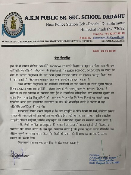 हिमाचल के स्कूल में रमजान पर भाषण: आदाब और उर्दू शब्दों का इस्तेमाल- अब मांगनी पड़ी माफी