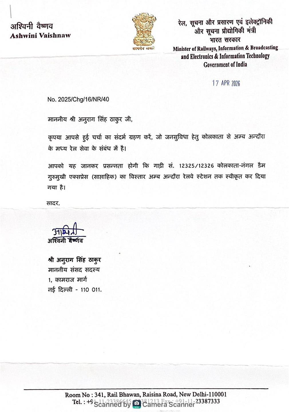 ऊना। हिमाचल प्रदेश में रेल नेटवर्क के विस्तार और आधुनिक बुनियादी ढांचे को लेकर एक बार फिर बड़ी खुशखबरी सामने आई है। केंद्र सरकार ने हमीरपुर संसदीय क्षेत्र के सांसद अनुराग सिंह ठाकुर की मांगों पर मुहर लगाते हुए नंगल डैम-कोलकाता गुरुमुखी सुपरफास्ट साप्ताहिक एक्सप्रेस को अब अंब-अंदौरा रेलवे स्टेशन तक चलाने की अंतिम मंजूरी दे दी है। इस फैसले से न केवल हिमाचल की रेल कनेक्टिविटी पश्चिम बंगाल तक सीधी हो गई है, बल्कि पर्यटन, तीर्थाटन और व्यापारिक गतिविधियों को भी एक नई उड़ान मिलेगी।