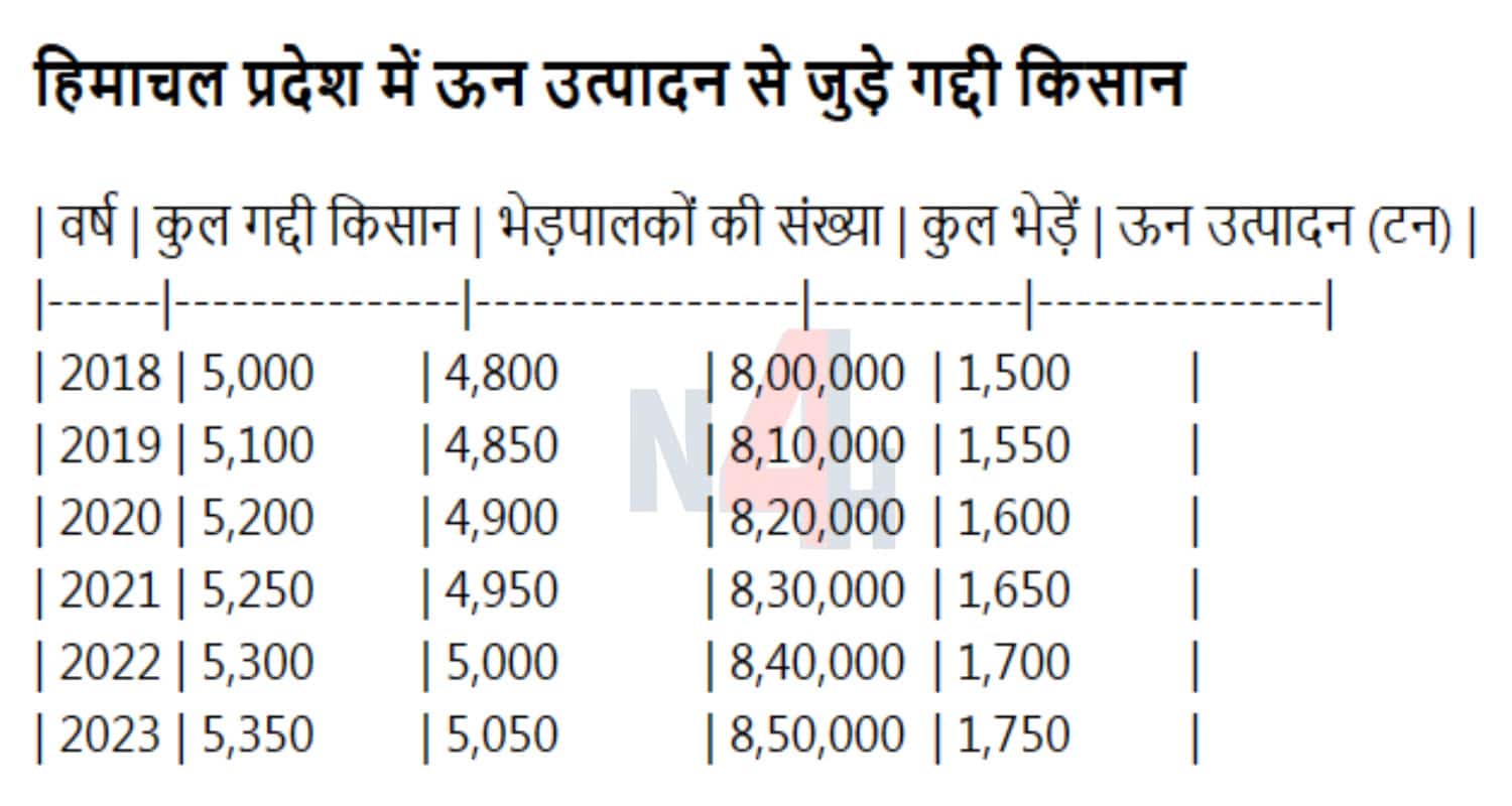 हिमाचल प्रदेश में 2023 की स्थिति में भेड़ पालक गद्दी किसानों की संख्या 5050 है। वहीं भेड़ों की संख्या भी बढ़कर साढ़े 8 लाख को पार कर चुकी है। इन भेड़ों से सालाना 170 टन ऊन पैदा होता है।