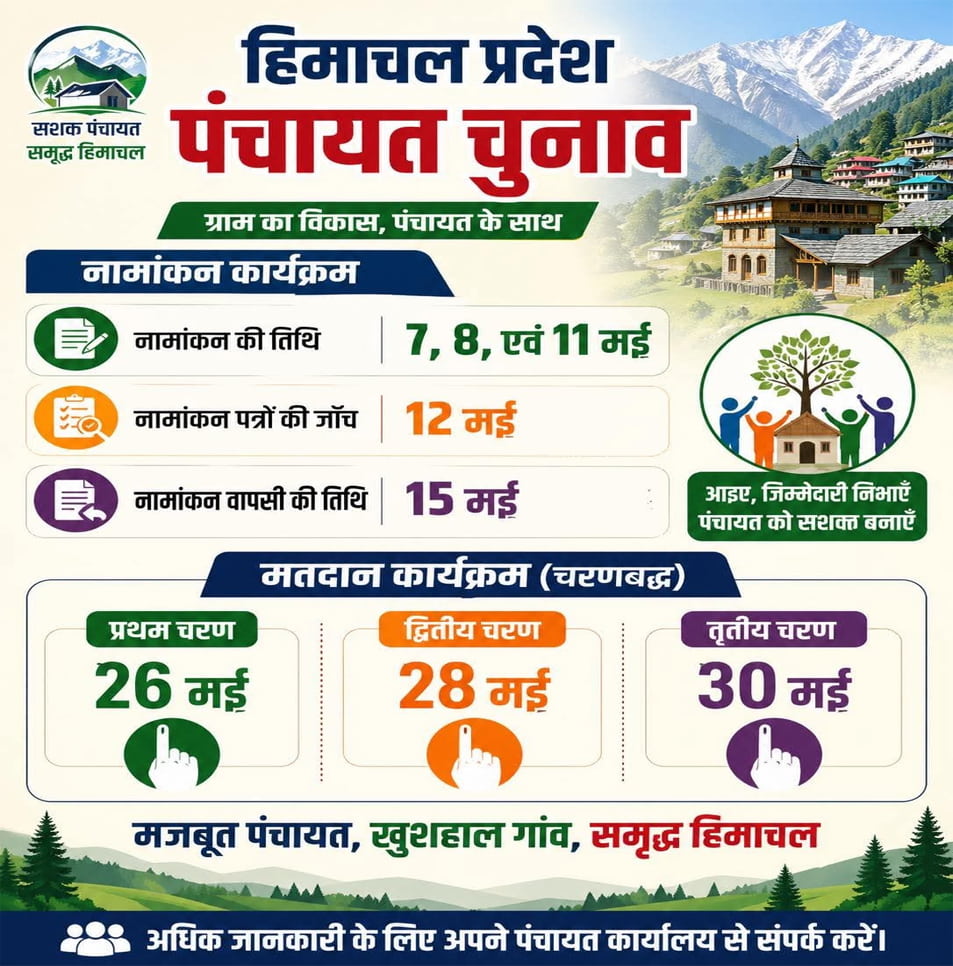 शिमला। हिमाचल प्रदेश में पंचायत चुनावों का आधिकारिक ऐलान हो गया है, जिसके साथ ही पूरे प्रदेश में सियासी सरगर्मियां तेज हो गई हैं। राज्य चुनाव आयुक्त अनिल खाची ने जानकारी देते हुए बताया कि चुनाव तीन चरणों में 26, 28 और 30 मई को कराए जाएंगे। चुनाव कार्यक्रम घोषित होते ही प्रदेश भर में आदर्श आचार संहिता लागू कर दी गई है, जिसका पालन सभी के लिए अनिवार्य होगा।
