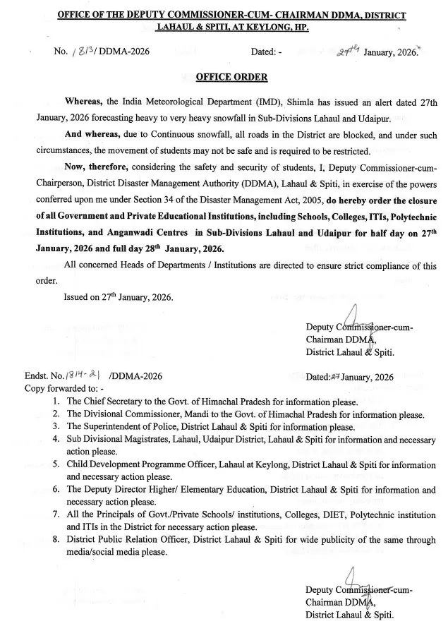 मौसम के कड़े तेवरों को देखते हुए जिला प्रशासन ने उपमंडल लाहौल और उदयपुर में सभी सरकारी और निजी शिक्षण संस्थानों को बंद रखने के आदेश जारी किए हैं। भारी बर्फबारी के चलते छात्रों और कर्मचारियों की सुरक्षा को ध्यान में रखते हुए यह निर्णय लिया गया है।