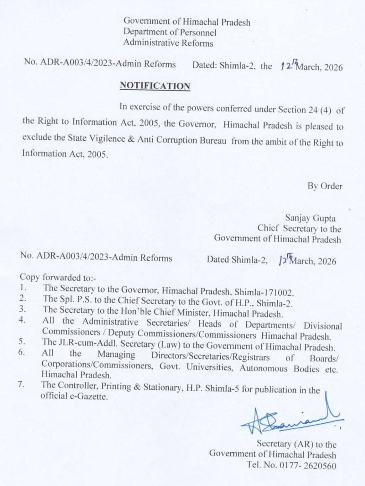 सरकार द्वारा जारी अधिसूचना की प्रतियां राज्यपाल सचिवालय, मुख्यमंत्री कार्यालय, सभी प्रशासनिक सचिवों, मंडलायुक्तों, उपायुक्तों और विभिन्न बोर्ड-निगमों को भेज दी गई हैं। साथ ही इसे आधिकारिक ई-गजट में प्रकाशित करने के निर्देश भी दिए गए हैं।