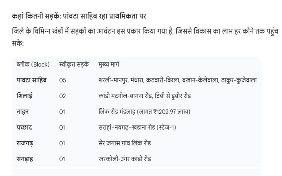 पांवटा साहिब ब्लॉक को इस योजना के तहत सबसे ज्यादा फायदा मिलने जा रहा है। यहां 5 नई सड़कों का निर्माण किया जाएगा, जिन पर करीब 35 करोड़ रुपये से अधिक की लागत आएगी। इन सड़कों के बनने से दर्जनों गांवों की कनेक्टिविटी मजबूत होगी और स्थानीय लोगों को बाजार, स्कूल और अस्पताल तक पहुंचने में बड़ी राहत मिलेगी।
