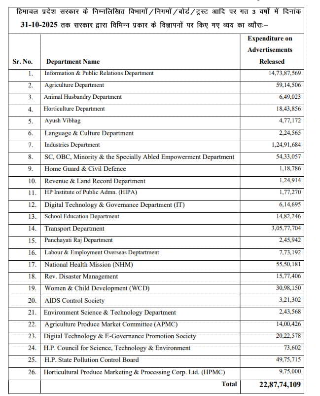 धर्मशाला से विधायक सुधीर शर्मा द्वारा पूछे गए सवाल के जवाब में सरकार ने सदन में जो आंकड़े रखे, उनके अनुसार 31 अक्टूबर 2025 तक के तीन वर्षों में विभिन्न विभागों और बोर्डों ने विज्ञापनों पर कुल 22,87,74,109 (22.87) करोड़ रुपये खर्च किए हैं। यह राशि ऐसे समय में सामने आई है जब सरकार खुद संसाधनों की कमी का हवाला देती रही है।