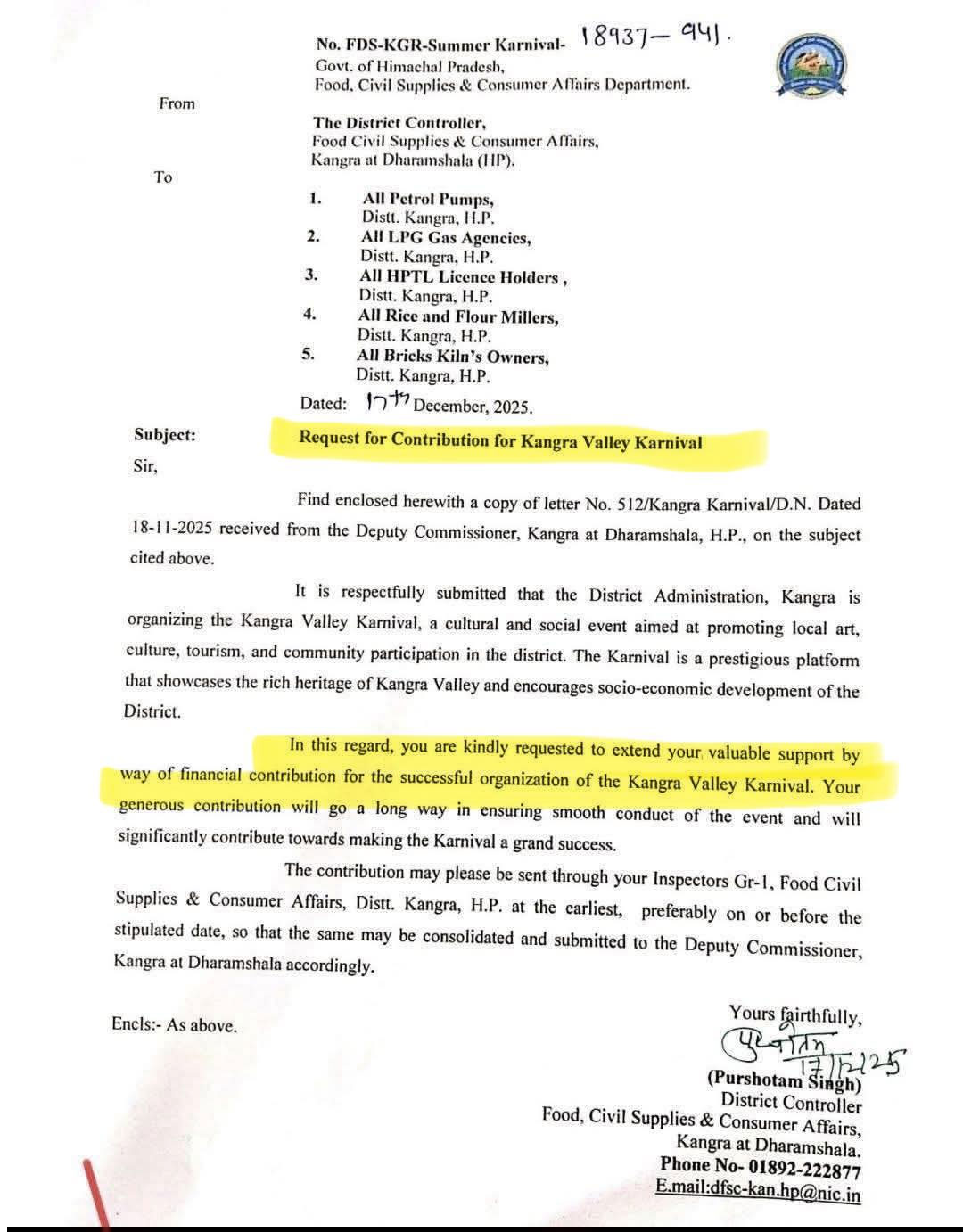 खाद्य, नागरिक आपूर्ति एवं उपभोक्ता मामले विभाग कांगड़ा की ओर से 18 नवंबर को जारी पत्र में पेट्रोल पंप संचालकों, एलपीजी गैस एजेंसियों, एचपीटीएल लाइसेंस धारकों, चावल और आटा मिल मालिकों तथा ईंट भट्ठा संचालकों से सहयोग की अपील की गई है। प्रशासन का तर्क है कि कार्निवाल के माध्यम से पर्यटन और स्थानीय संस्कृति को बढ़ावा दिया जाएगा, लेकिन सहयोग की यह अपील अब सरकार के लिए उलटा सिरदर्द बन गई है।